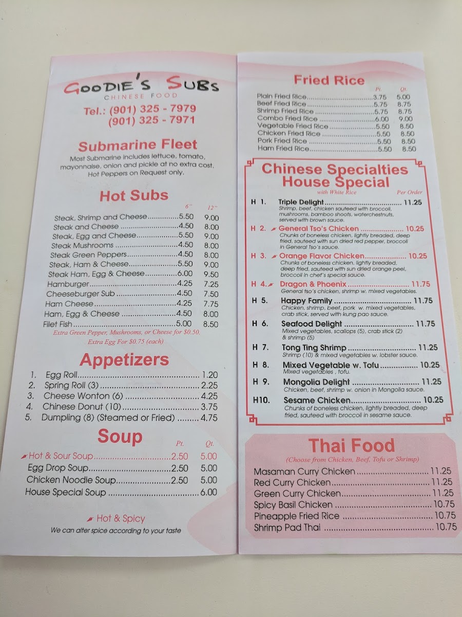 Located at 3527, 2962 Poplar Ave in Memphis, TN, Goodie's Subs offers a delightful culinary experience with a diverse menu that caters to various tastes. Start your meal with crispy appetizers like the Egg Roll or the flavorful Shrimp Roll, perfect for sharing. For seafood enthusiasts, dishes such as Shrimp with Cajun butter and Green Mussel are seasoned to perfection, bursting with rich flavors.